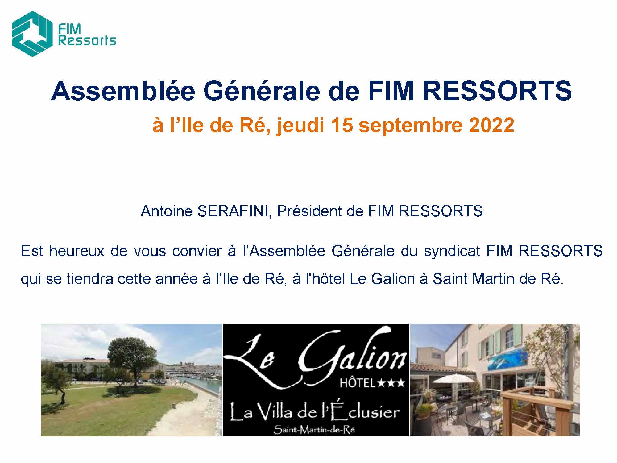 Antoine SERAFINI, Président de FIM RESSORTS, a réuni les adhérents du syndicat à l’Ile de Ré pour l’Assemblée Générale 2022. Accueillis à l’hôtel Le Galion à Saint-Martin-de-Ré, les participants se sont retrouvés autour d’un déjeuner à la Villa de l’Eclusier, qui a également accueilli les travaux de l’Assemblée Générale dans l’après-midi. La journée s’est conclue par un apéritif et un dîner au restaurant Le Richelieu à La Flotte, dans une ambiance chaleureuse face à l’océan. Un grand merci à tous les adhérents et partenaires présents pour cette belle journée d’échanges au cœur de l’Ile de Ré.