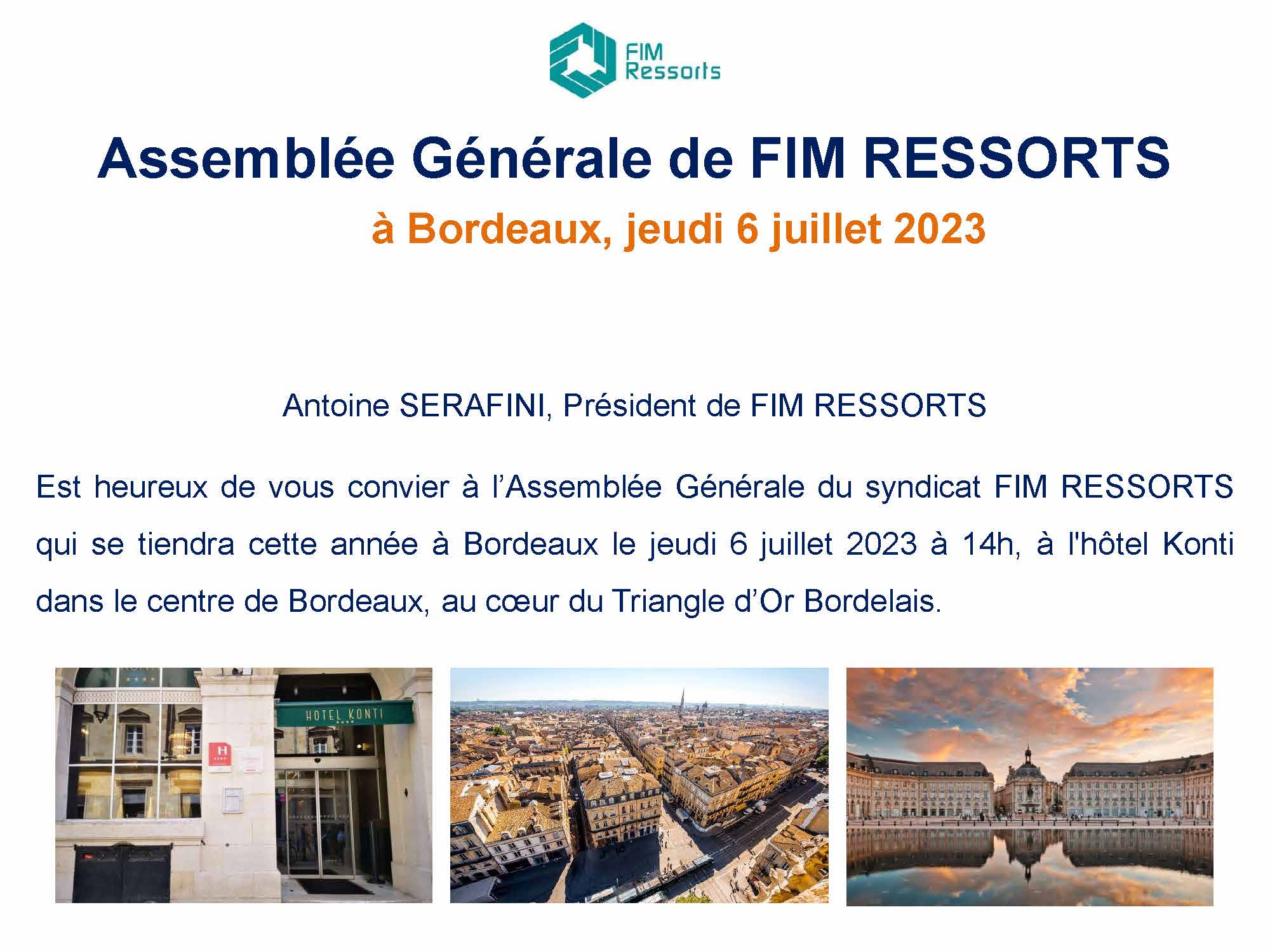 C’est à Bordeaux, au cœur du Triangle d’Or, que FIM RESSORTS a réuni ses adhérents pour son Assemblée Générale 2023. La journée a débuté par un accueil et un déjeuner à l’hôtel Konti, rue Montesquieu, suivis des travaux statutaires de l’Assemblée Générale. En fin de journée, les participants ont eu le privilège de découvrir l’exposition immersive consacrée à Salvador Dalí aux Bassins des Lumières, le plus grand centre d’art numérique au monde, installé dans les alvéoles de l’ancienne base sous-marine de Bordeaux. La soirée s’est terminée autour d’un dîner convivial. Merci à tous les adhérents pour leur participation à cette édition particulièrement réussie.