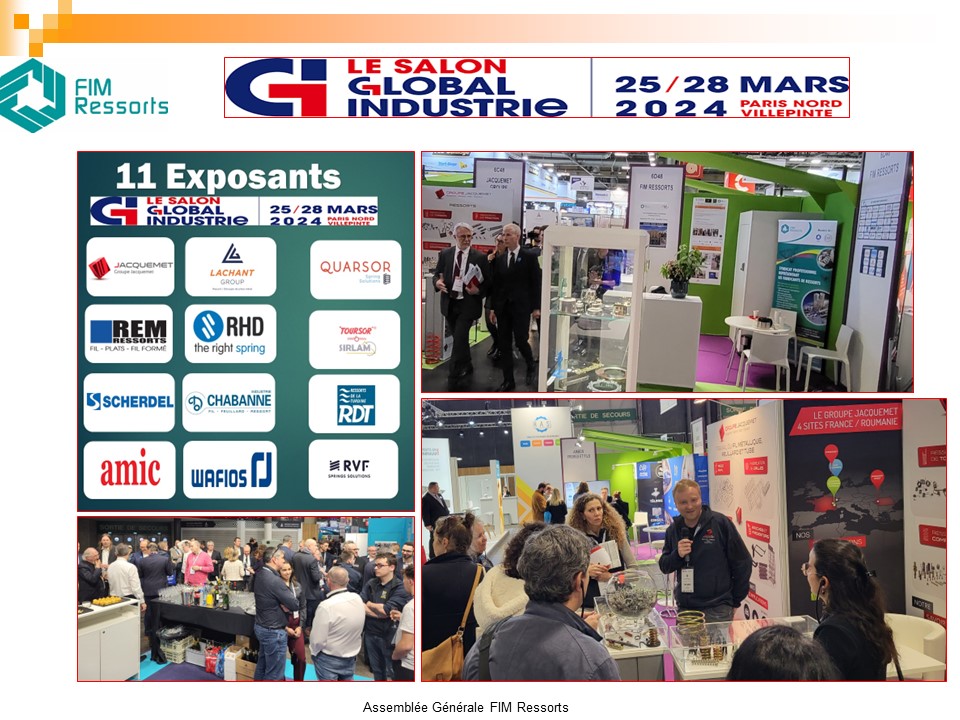 Et voilà, le salon Global Industrie 2024 a fermé ses portes après une semaine riche en contacts pour les entreprises exposantes sur l’espace dédié à la profession du ressort. Du 25 au 28 mars 2024, à Paris Nord Villepinte, FIM RESSORTS a réuni 11 exposants adhérents du syndicat autour d’un stand collectif mettant à l’honneur le savoir-faire français de la fabrication de ressorts. FIM RESSORTS tient à remercier officiellement les organisateurs de GL Events pour cet évènement, ainsi que les entreprises adhérentes qui nous ont accordé leur confiance pour exposer à nos côtés : AMIC, CHABANNE, JACQUEMET, LACHANT GROUP, QUARSOR, RDT (Ressorts de la Touraine), REM RESSORTS, RHD, RVF Springs Solutions, SCHERDEL et TOURSOR/IRLAM. Un grand merci également à notre partenaire WAFIOS pour son soutien sur le stand, ainsi qu’à l’ensemble des visiteurs, donneurs d’ordres et confrères venus à la rencontre de la profession tout au long de la semaine. Cette édition 2024 confirme le dynamisme de notre filière et la qualité des échanges entre fabricants, clients et prescripteurs, et nous donne déjà rendez-vous pour la prochaine édition de Global Industrie.